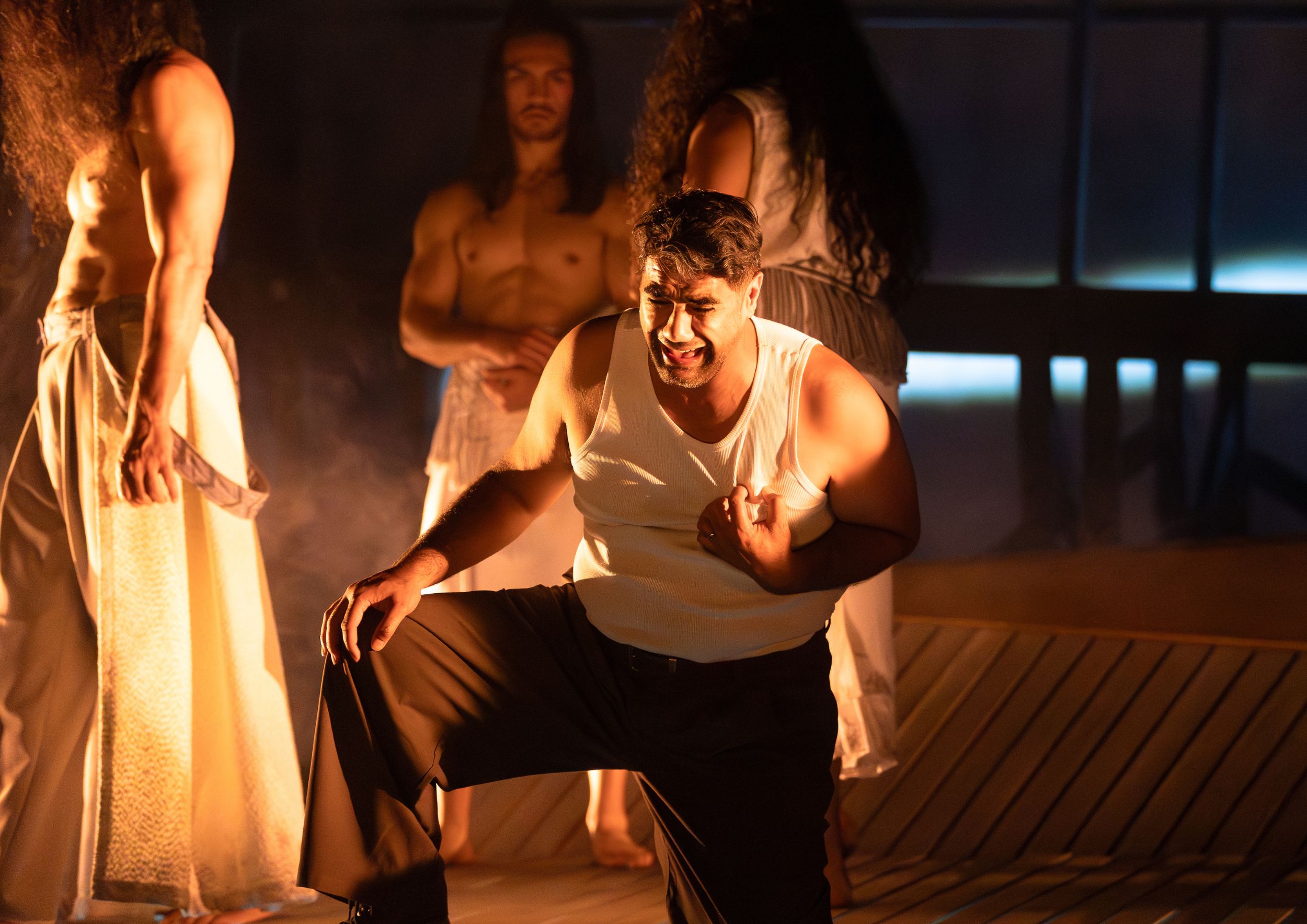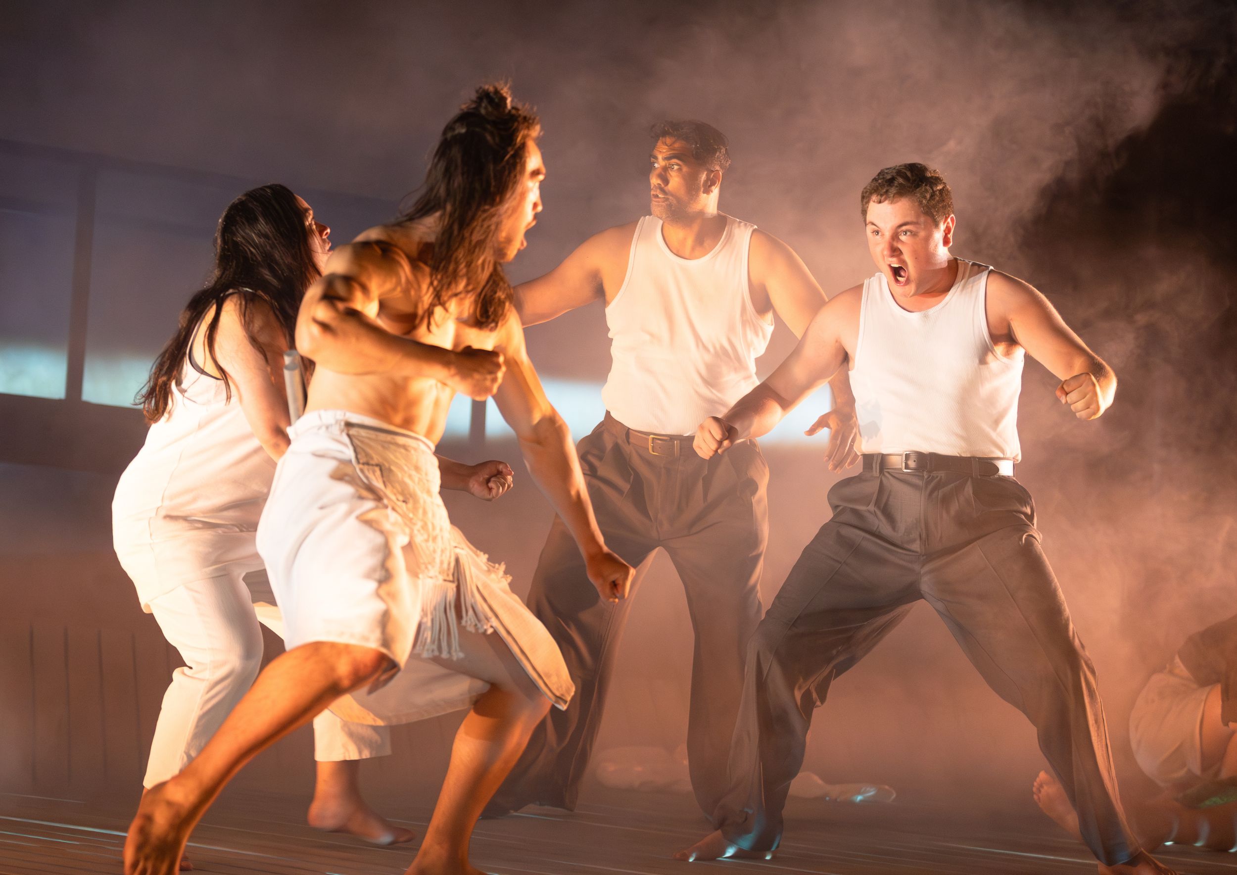 Includes strobe lighting, haze, loud and sudden sounds, racist and strong language, depictions of physical violence and family harm, and themes of colonisation and its impact on iwi Māori and whānau Māori.